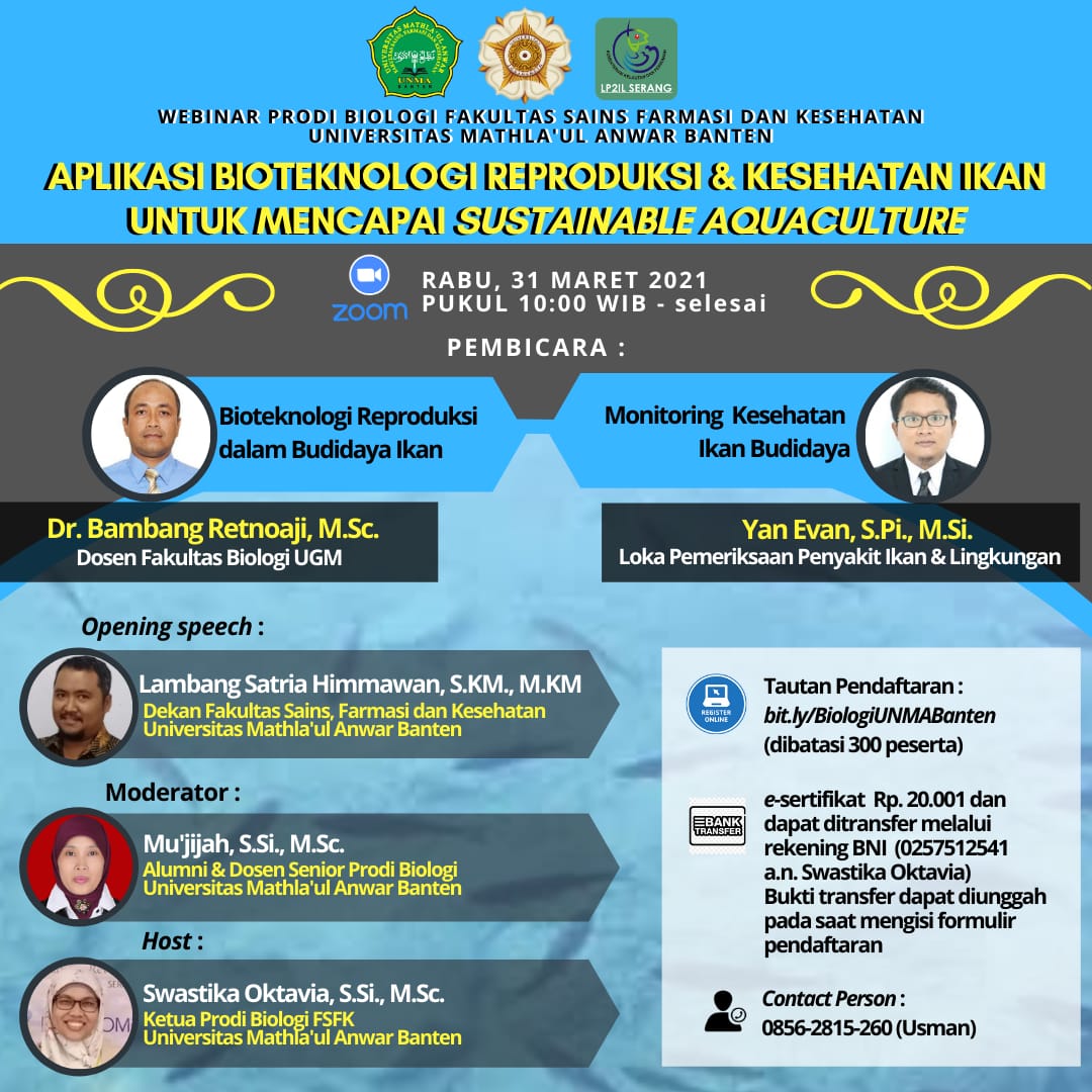 Program Studi Biologi, Fakultas Sains, Farmasi dan Kesehatan, Universitas Mathla'ul Anwar Banten mengadakan Webinar dengan Tema "Aplikasi Bioteknologi Reproduksi & Kesehatan Ikan Untuk Mencapai Sustainable Aquaculture " yang akan diselenggarakan pada: